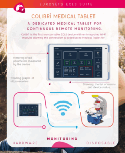 🔹 Colibrì Tablet: consente la visualizzazione dei parametri di Colibrì con grafici e allarmi personalizzabili e, abbinata a sonde Wi-Fi, monitora i parametri venosi e arteriosi dei pazienti ECMO.
